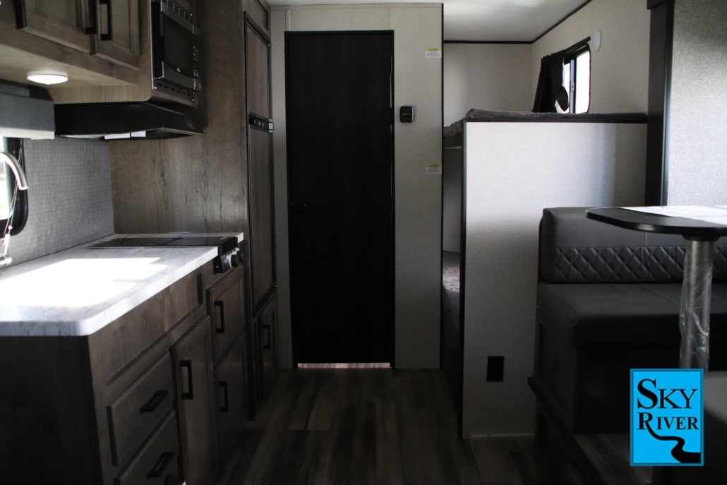 The Autumn Ridge is designed to hold 6 people through its 2 bunk beds, 1 sofa bed, and 1 queen bed. The queen bed and bunk beds are at opposite ends of the RV as well, which does add some extra privacy. There is only one rear bathroom on the Autumn Ridge, but it is a dry bath which means the showering and sink facilities can be used separately.