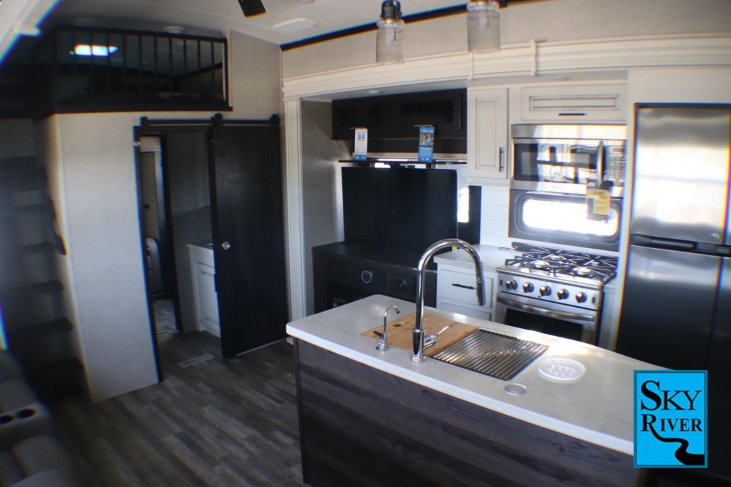 Designed to hold 7 people, this fifth wheel is just packed full of features for the whole family to enjoy. There are 2 separate bathrooms so your family can have full access to the sink and toilet even during shower hours. There are 2 separate TV areas, one at the master bedroom and another that works as a dedicated theater area. A fully furnished kitchen area is also provided and the overhead loft not only includes room for extra storage but it's a room of its own. You won't miss anything from your home in the 373BHOk.