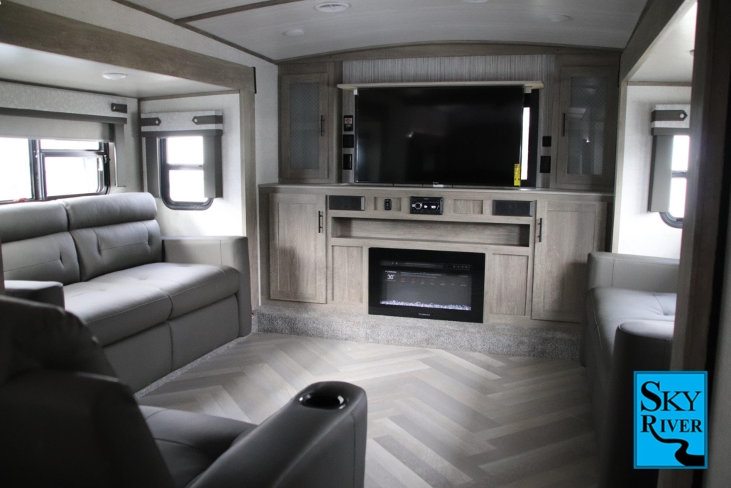 With a length of 43β² 6β³ and room for 8 people, the 378FL easily wins the competition for the largest RV on this list, and this shows on its floorplan. The entertainment center has a pop-up TV and fireplace as well as 3 different sofas so the entire family can enjoy a movie together. Next, we find the main living area with a fully furnished kitchen and pantry, as well as a dining area that is perfectly suited for all 8 of its potential residents. A master bedroom is conveniently located at the rear, but there is also a dedicated loft and bunk area right above it. The closest thing to a drawback is that there is only one bathroom, however, it is a dry one so it does allow for shared use.