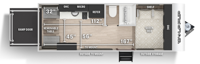 On the other end of the Forest River Wolf Pup spectrum is floorplan 18TO featuring a full slide-out. This additional space makes this a great option for families since it can sleep up to six. You can enjoy a gourmet kitchen, functional bath, and have space to stay warm and dry on a rainy day. You also have access to a mini kitchen and tv mount on the exterior allowing you to expand your living space during nice weather.