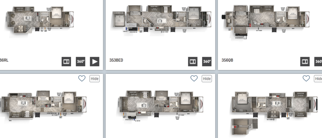 There are nine different floorplans to choose from including one toy hauler for anyone looking to bring equipment along with them on the road. The toy hauler includes everything else you need in an RV from a queen sized bed to a bathroom and chef's kitchen. You can have fun during the day and come back to a place where you can rest, relax, and recharge.