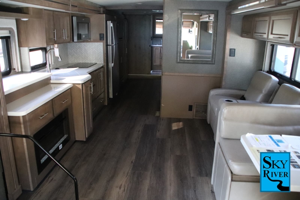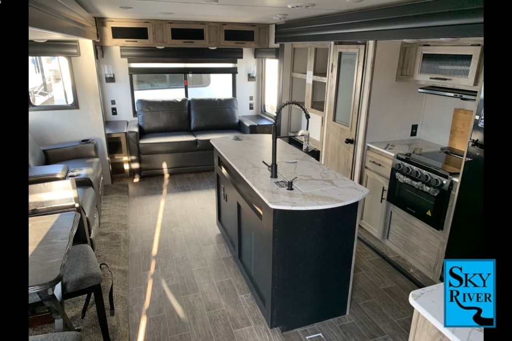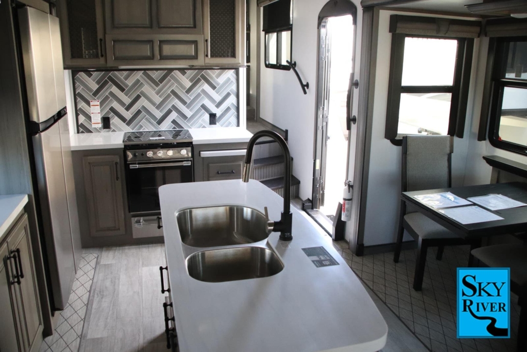 What do we love about this Keystone Montana for escapists? It has many of the touches and comforts of home. The bedroom has a private and secluded feel. The bathroom includes a double vanity making it easy to get ready without bumping into each other. The kitchen has a large island making meal prep fun and easy. There is a dining room table instead of the dinette many assume is in an RV. In addition, the living space feels like a living room instead of a dual-purpose space.