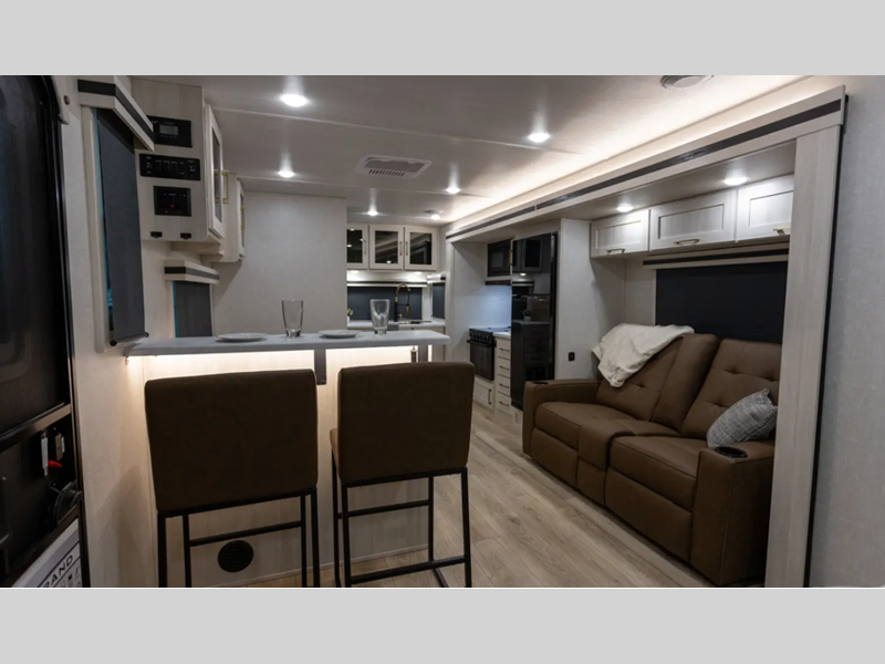 Sleeps 9 Slides 1 Length 35 ft 1 in Ext Width 8 ft Ext Height 11 ft 3 in Hitch Weight 804 lbs GVWR 9604 lbs Dry Weight 6806 lbs Cargo Capacity 2798 lbs Fresh Water Capacity 40 gals Grey Water Capacity 40 gals Black Water Capacity 30 gals Number Of Bunks 4 Available Beds Queen Refrigerator Type 12V Black Glass Refrigerator Size 10 cu ft Cooktop Burners 3 Number of Awnings 1 Water Heater Type Tankless AC BTU 15000 btu TV Info LR HD TV Awning Info 21' Electric w/LED Light Strip Axle Count 2 Washer/Dryer Available Yes Shower Type Standard Electrical Service 30 amp Solar Wattage 200 watts Similar Floorplans