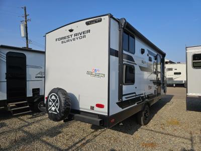 With any Surveyor Legend travel trailer by Forest River you will enjoy quality craftsmanship, convenient amenities, and at-home comforts. The Azdel composite walls provide a longer-lasting trailer, and the power tongue jack with hitch light makes getting back on the road quick and easy. There are also Goodyear® tires and a tire pressure monitoring system (TPMS) for more confident, hassle-free towing. Each model is built with thoughtful details like slam-latch exterior baggage doors and an automotive-style tinted front windshield that gives the front cap a sleek look while letting in natural light. You’ll appreciate camping with a tankless water heater for endless hot showers, a 2" rear accessory hitch to bring bikes or extra gear along, plus a central vacuum system that helps keep your easy-to-clean interior looking fresh.