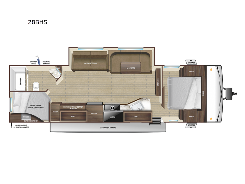 You and the whole family will have a fun time camping in this dual axle trailer! The kiddos can sleep on the corner set of double-size bunk beds and you will have your own privacy with the front private bedroom which has wardrobes on either side of the bed. You could even transform the U-shaped dinette and jack-knife sofa slide into extra sleeping spaces for a couple of cousins to tag along too. Everyone will stay squeaky clean with the shower in the rear corner bathroom, and there is even an exterior sprayer hose to wash the mud off your feet before entering inside the trailer. The chef will enjoy cooking delicious meals indoors, but love being able to breathe in some fresh air while cooking at the outside kitchen. When mother nature rains on your parade, simply head inside and enjoy the entertainment center!