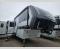 You're going to love every minute spent in this spacious fifth wheel that can sleep four. There is an inviting rear living area with a 72" tri-fold sofa and theater seating across from the televator and fireplace. The chef of your group can whip up dinner on the three burner cooktop or in the 30" residential microwave, and there is a 16 cu. ft. refrigerator that even opens when with the slide out is in. You will also enjoy the kitchen island with a farmhouse sink and roller cover, dual trash bins with a Stow N' Go paper towel holder, plus convenient dog bowls for your furry friends. You can store all your paper goods and snacks in the 84" pantry with adjustable shelving, and there is a hutch for nice dishes plus shoe storage in this model as well. Head to the front master bedroom where you'll find a queen bed with a TV, a large slide out with a wardrobe with drawers, plus a spacious bath.