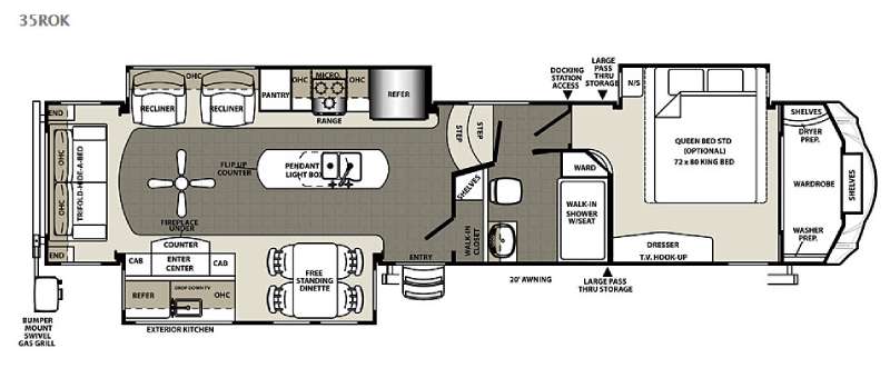 There are plenty of overhead cabinets throughout the fifth wheel, as well as a large pass thru storage. Outside you will enjoy the exterior kitchen as well as a bumper mount swivel gas grill.